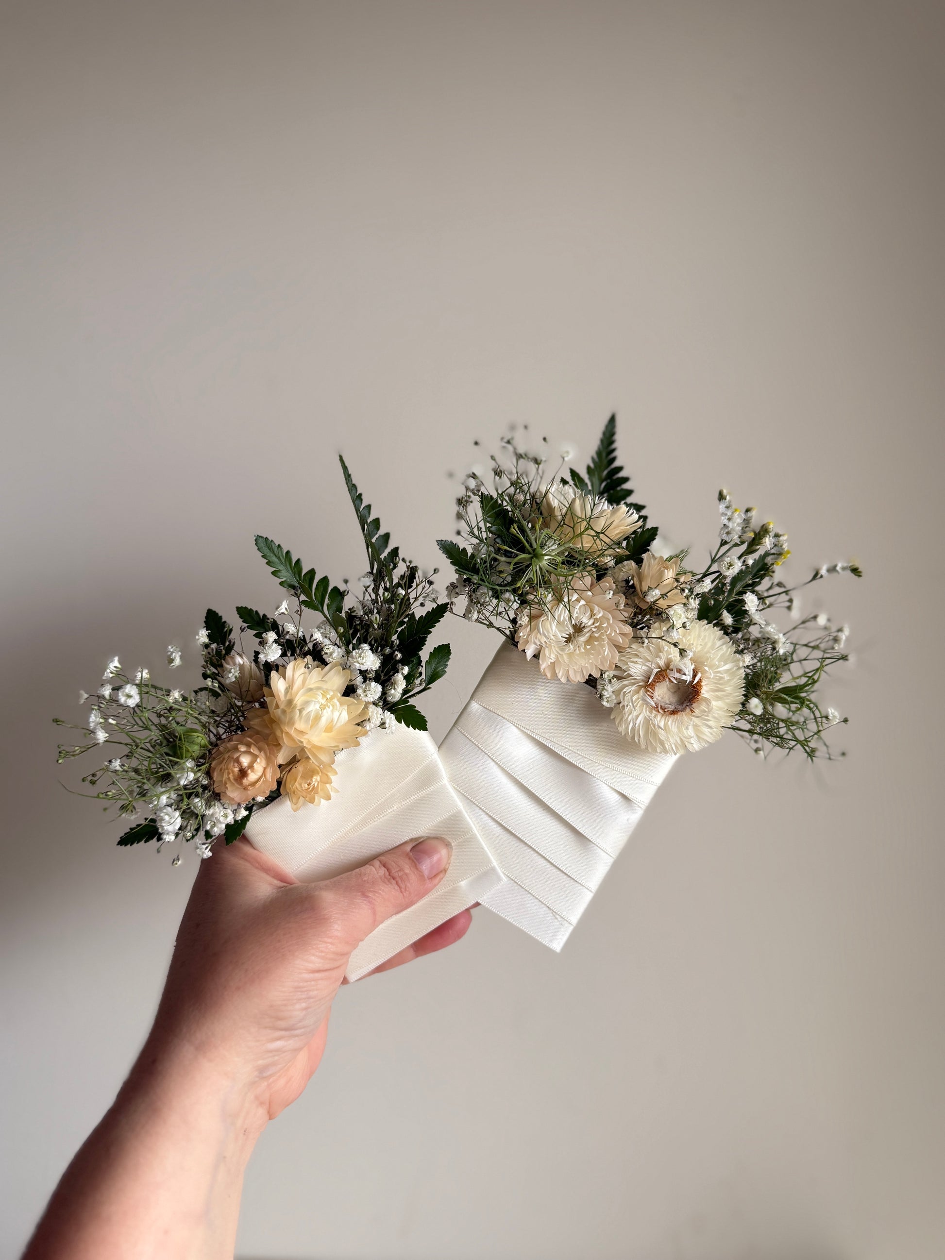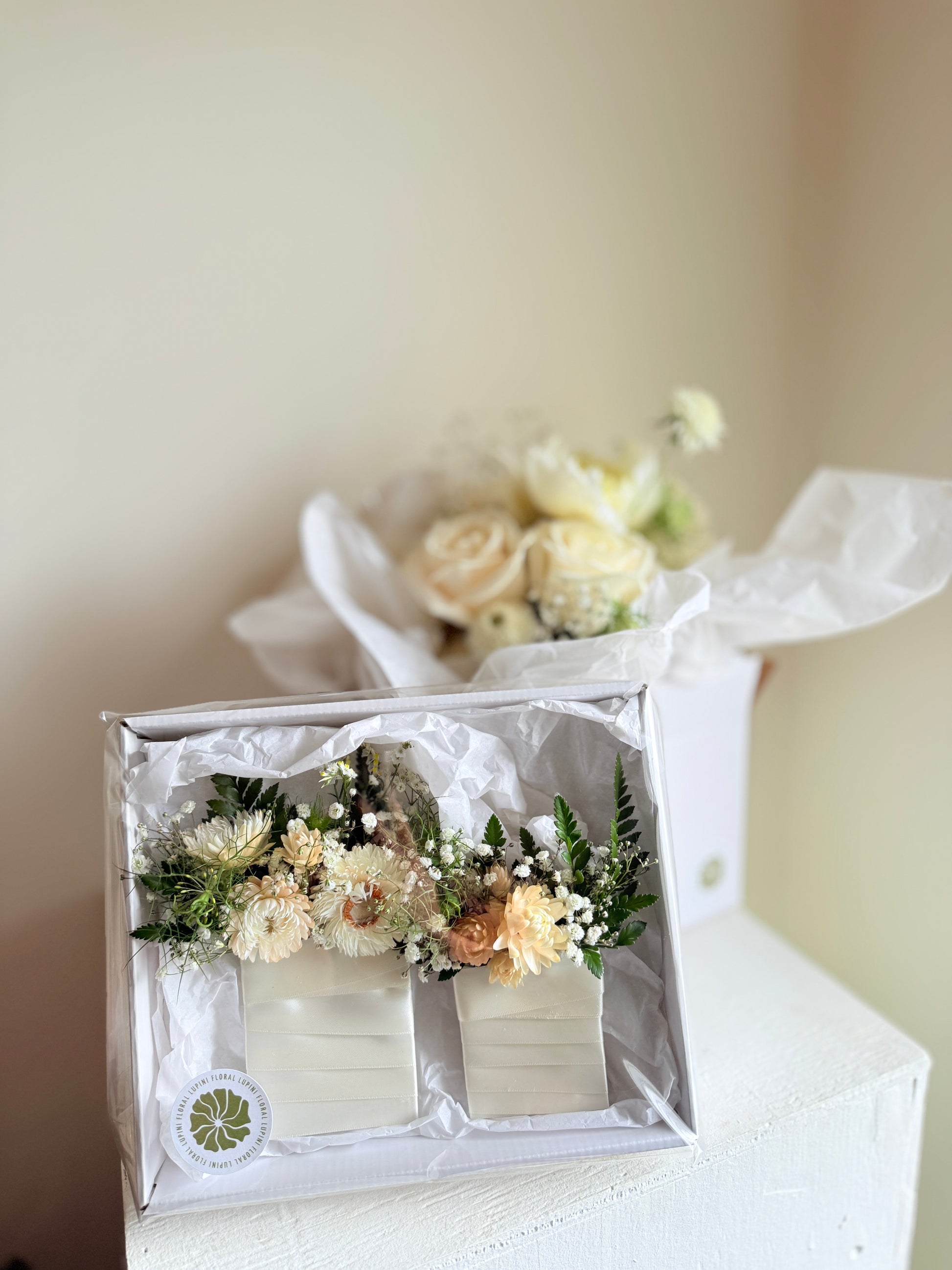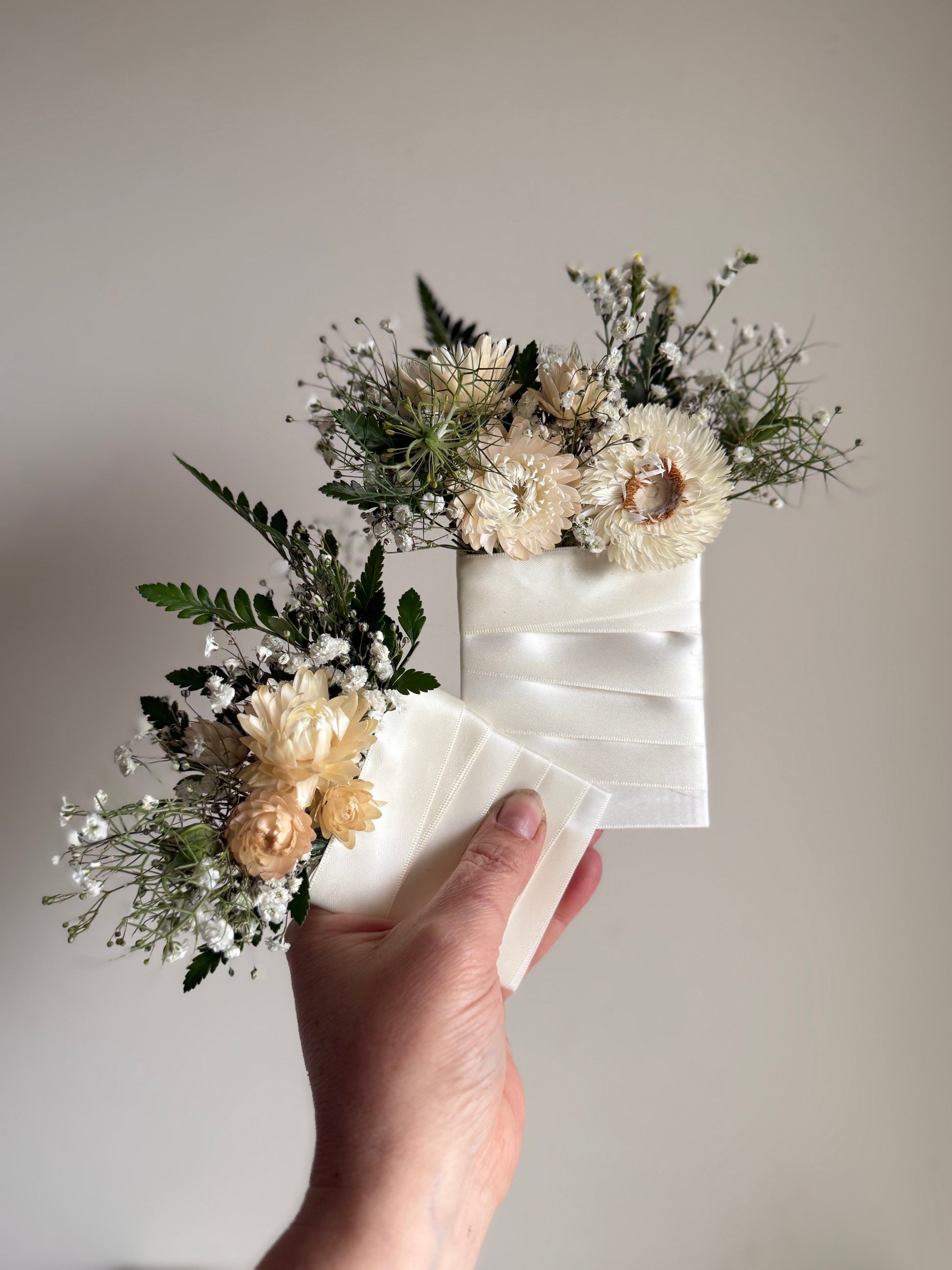 A modern alternative to the classic boutonnière. Designed to slip neatly into a jacket pocket, this small floral cluster adds character and sophistication — composed to mirror your chosen palette and design style.
